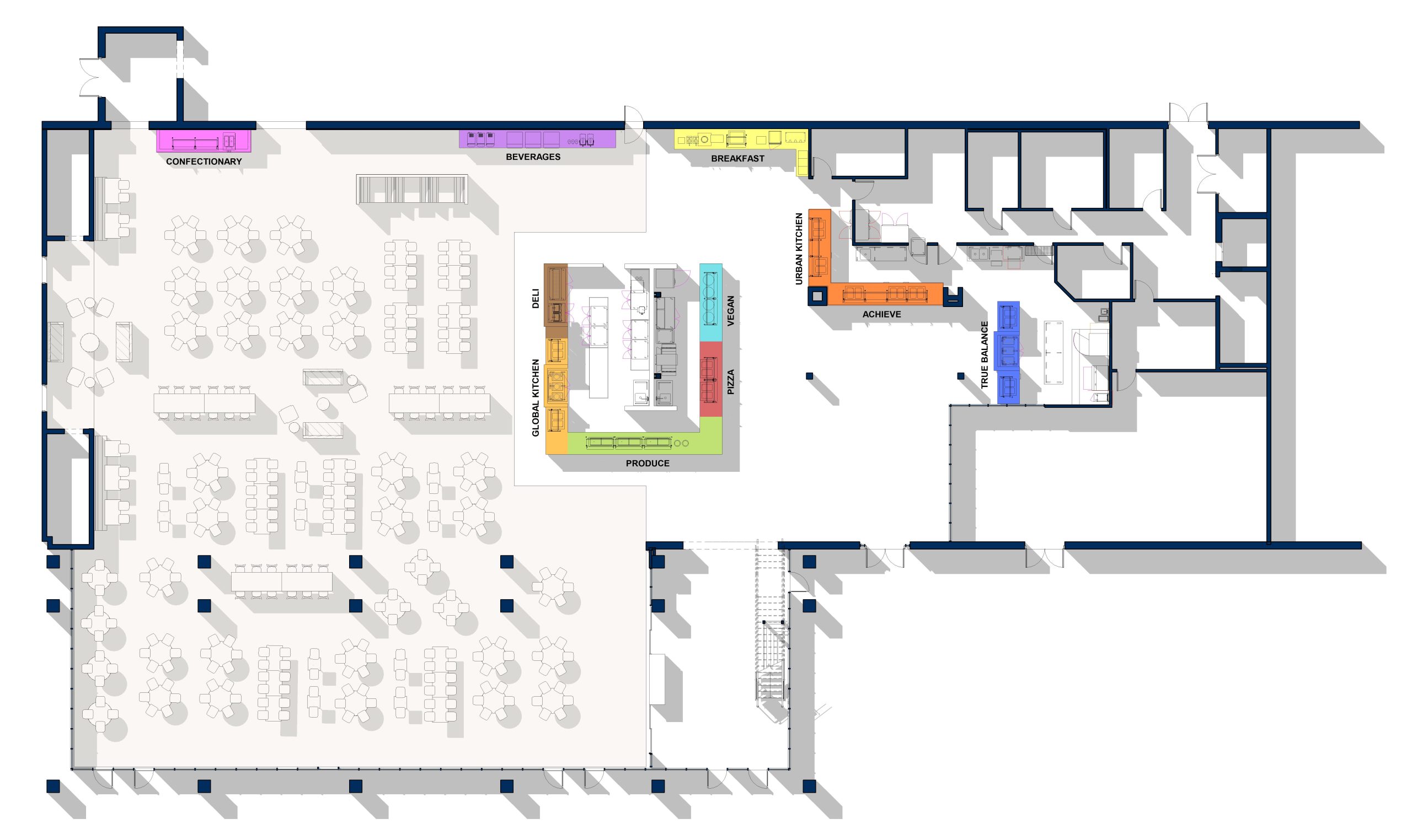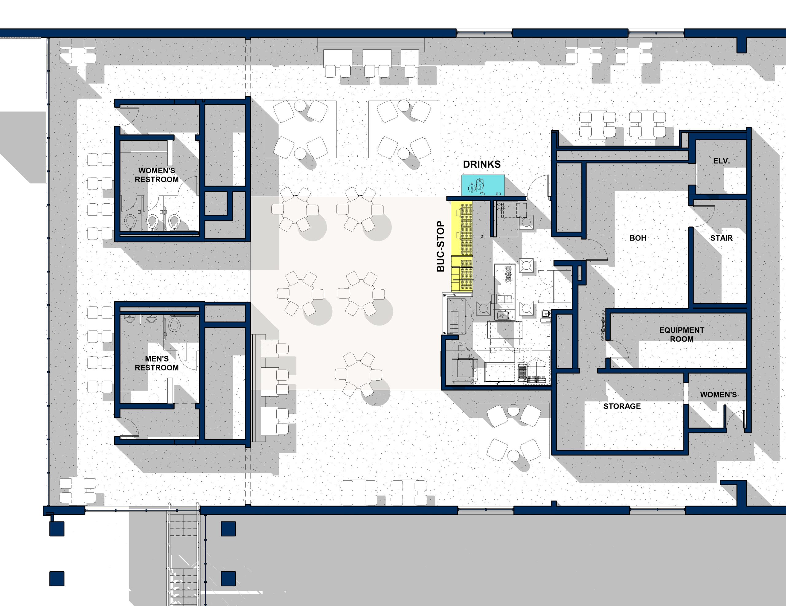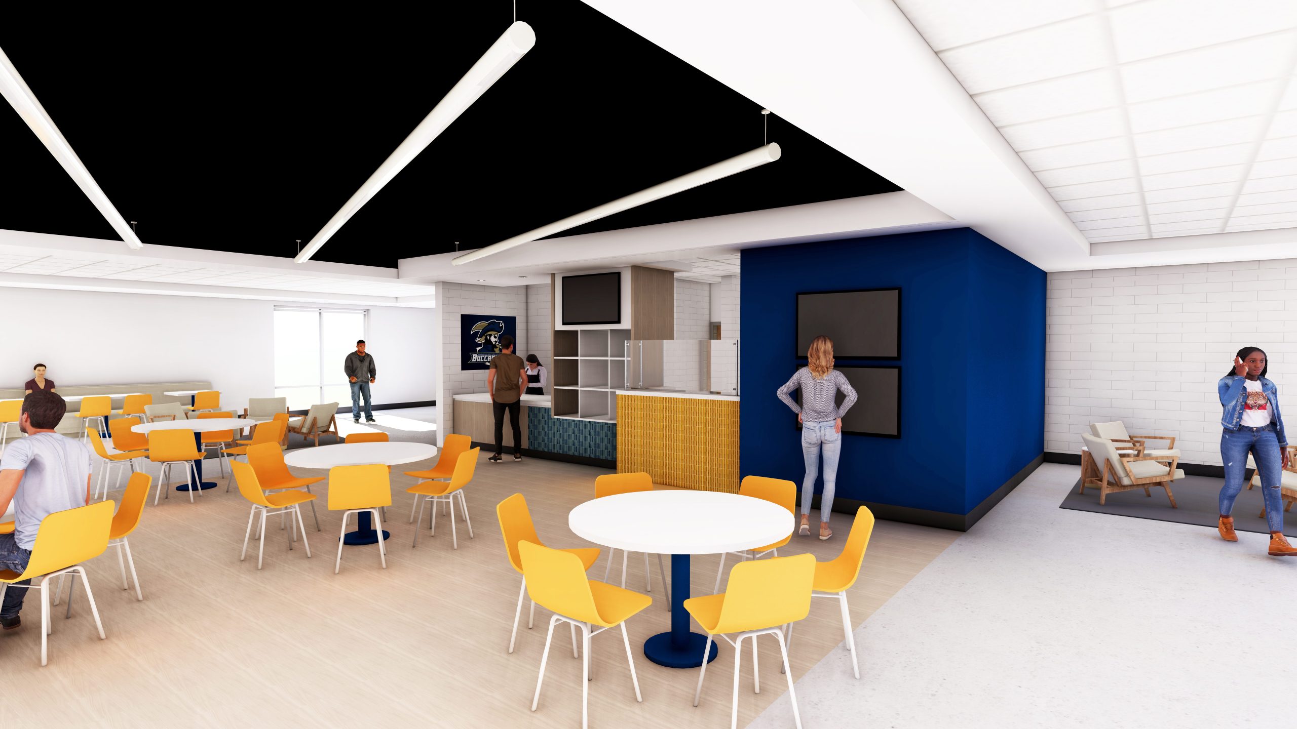 The more notable changes will include the removal of the stairs to a mezzanine in the dining hall, enclosing the mezzanine with glass, and expanding the space in the Student Center’s Buc Stop to include additional seating. Food stations in the dining hall will be branded with themes offering unique options, such as: